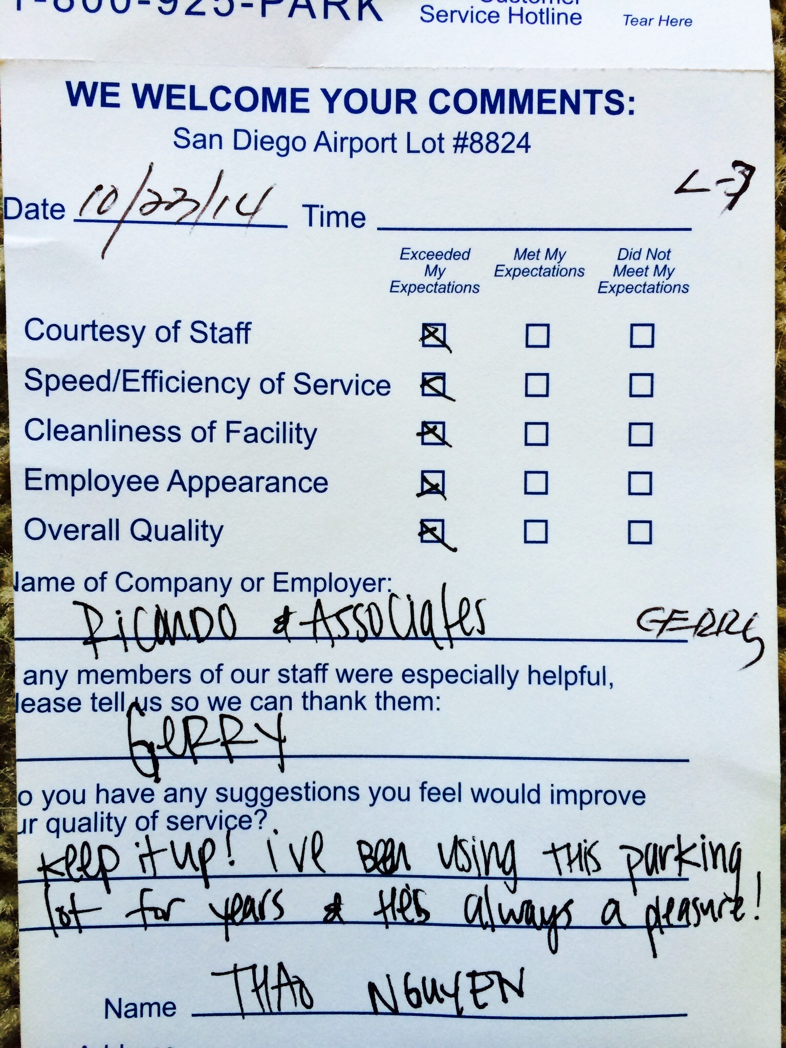 Not sure if this counts much, but for at least two years, this old man at the San Diego International Airport always brightened my day as I exited the parking lot. I heard they get perks for good feedback so I’m sending a comment card in today!
